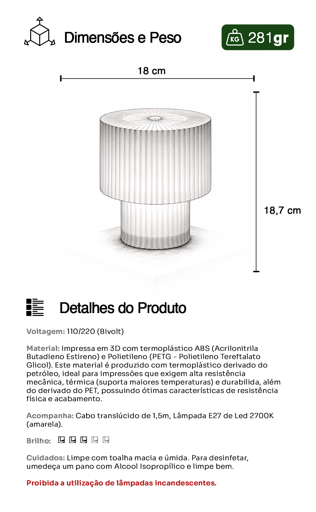Seu corpo cilíndrico canelado cria um jogo contínuo de luz e sombra, enquanto o núcleo luminoso central revela a ideia de camadas com a luz que nasce de dentro, se expande e envolve o ambiente com suavidade. O topo radial, preciso e geométrico, adiciona um detalhe técnico que contrasta com a sensação acolhedora da iluminação.